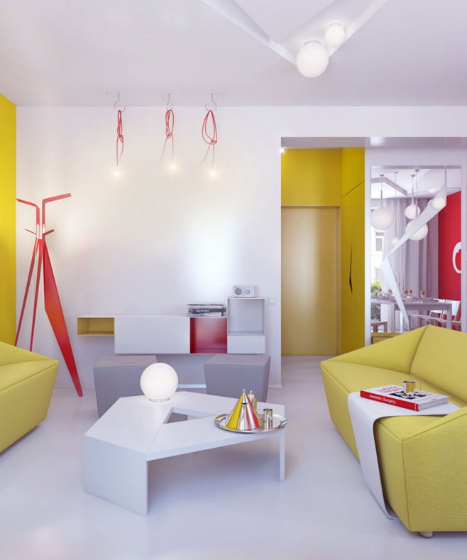 Yellow goes well with red, green, gray tones, with blue and purple tones, it will also be combined, but a more careful selection is needed. When combining yellow tones in the living room take into account the "temperature" of colors, combine cold shades with cold, warm with warm.