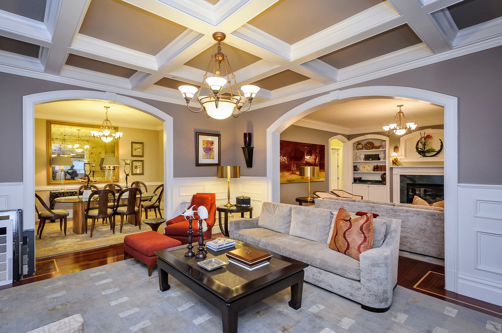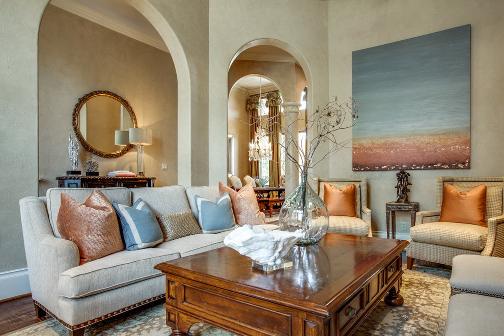 The arch between the living room and the kitchen or dining room will allow you to simultaneously divide the rooms and at the same time maintain a certain line between two different spaces.