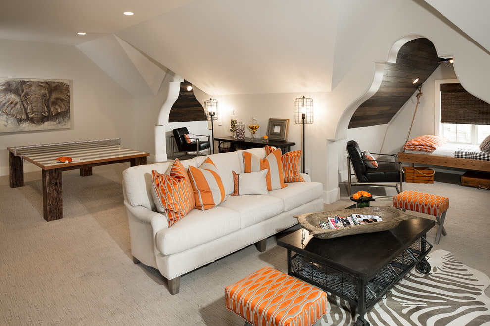 If the hall contains such architectural elements as a fireplace, a bay window or a staircase, then they can be played out in an original way with the help of vaulted structures, for example, using an arch, it turns out not only to beautifully design a bay window ledge, but also to separate the working area located in it with a table or place relaxing with a sofa, from the living room.