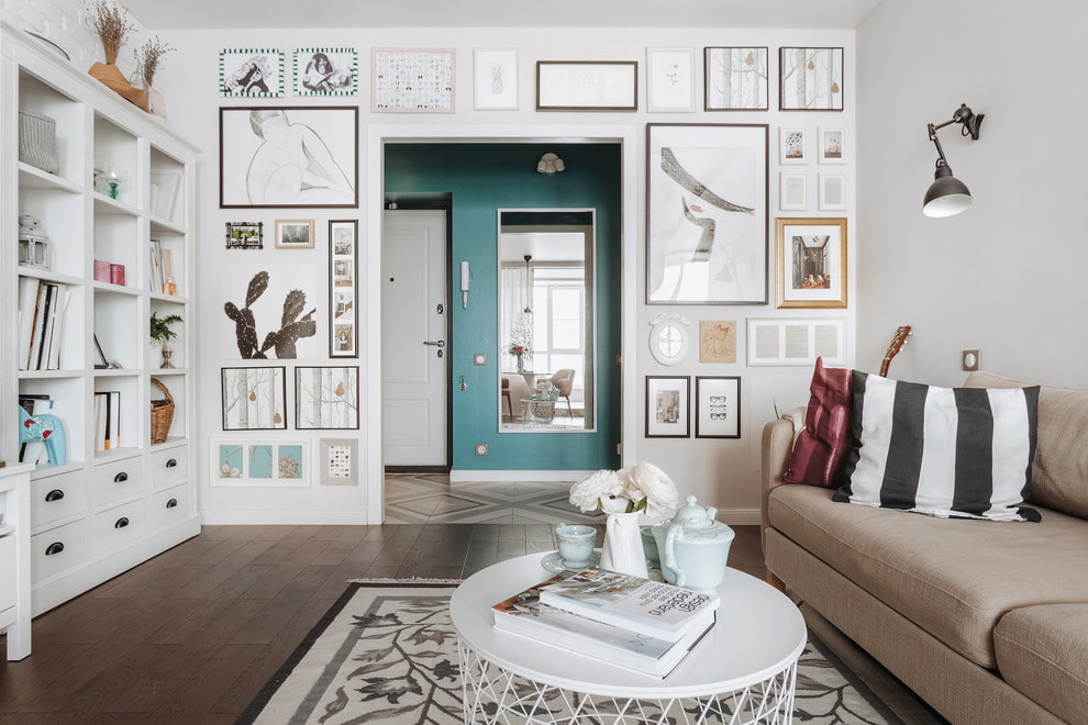 The photo shows the interior of the hall in the Scandinavian style with a wide white arch.