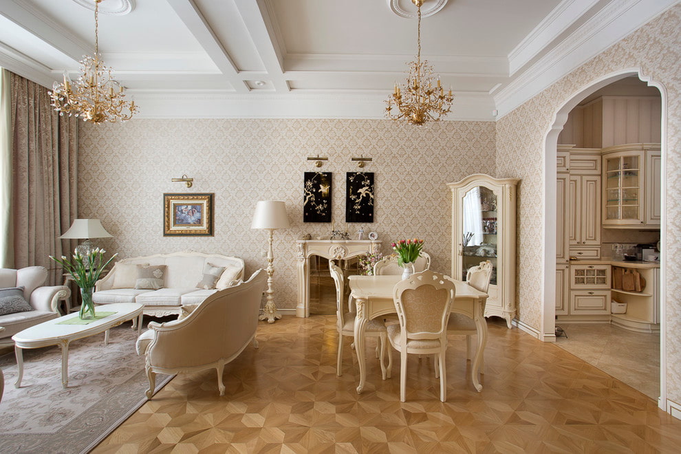Traditional or curly arches are an almost indispensable element of the classic style. Passages of noble colors and textures are often decorated with plaster moldings, moldings, golden or silver ornaments, side columns and semi-columns, sculptural details or carvings.