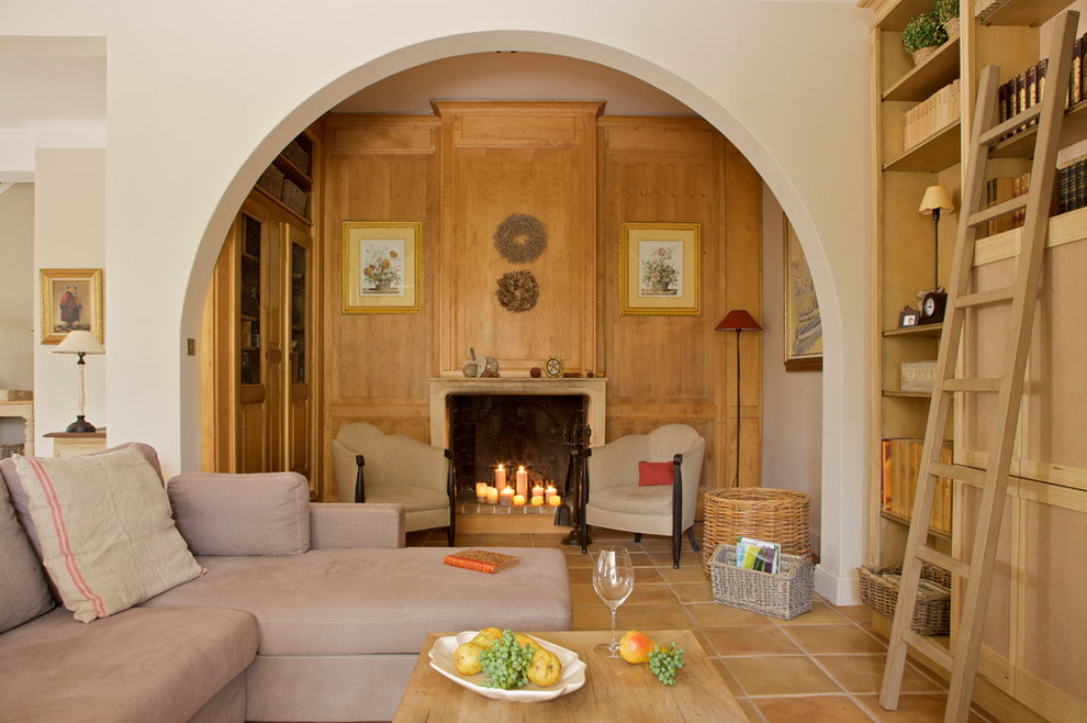 For Provence, rectangular structures made of stone, wood, MDF, fiberboard or other materials of natural origin will be appropriate. Also, arches are often decorated with floral ornaments or artificial aging is used.