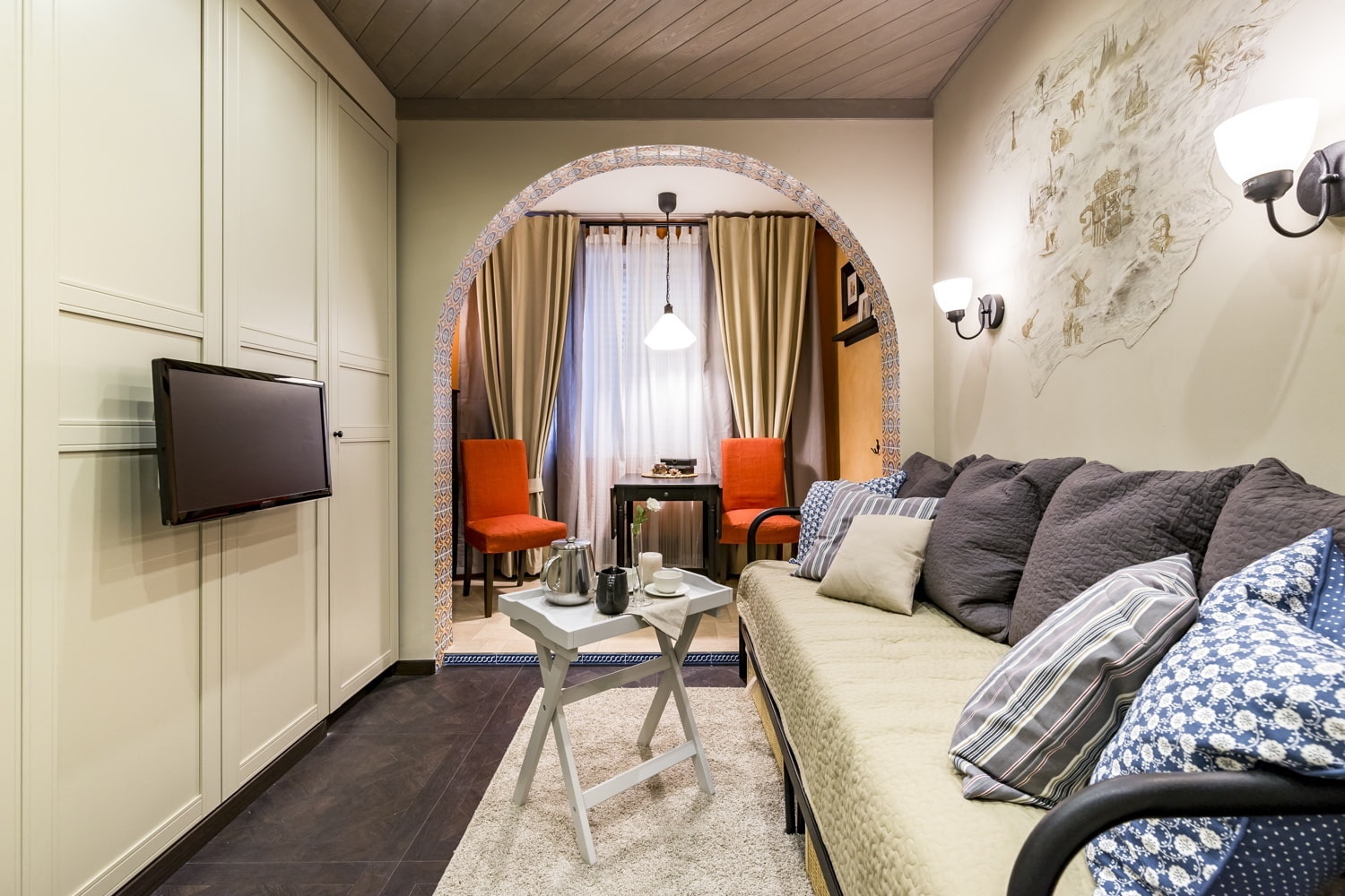 In the case of a single style design of the hall and bedroom, a beautiful arched structure will become an excellent interior element for visually combining the design of two different rooms and forming a coherent composition.