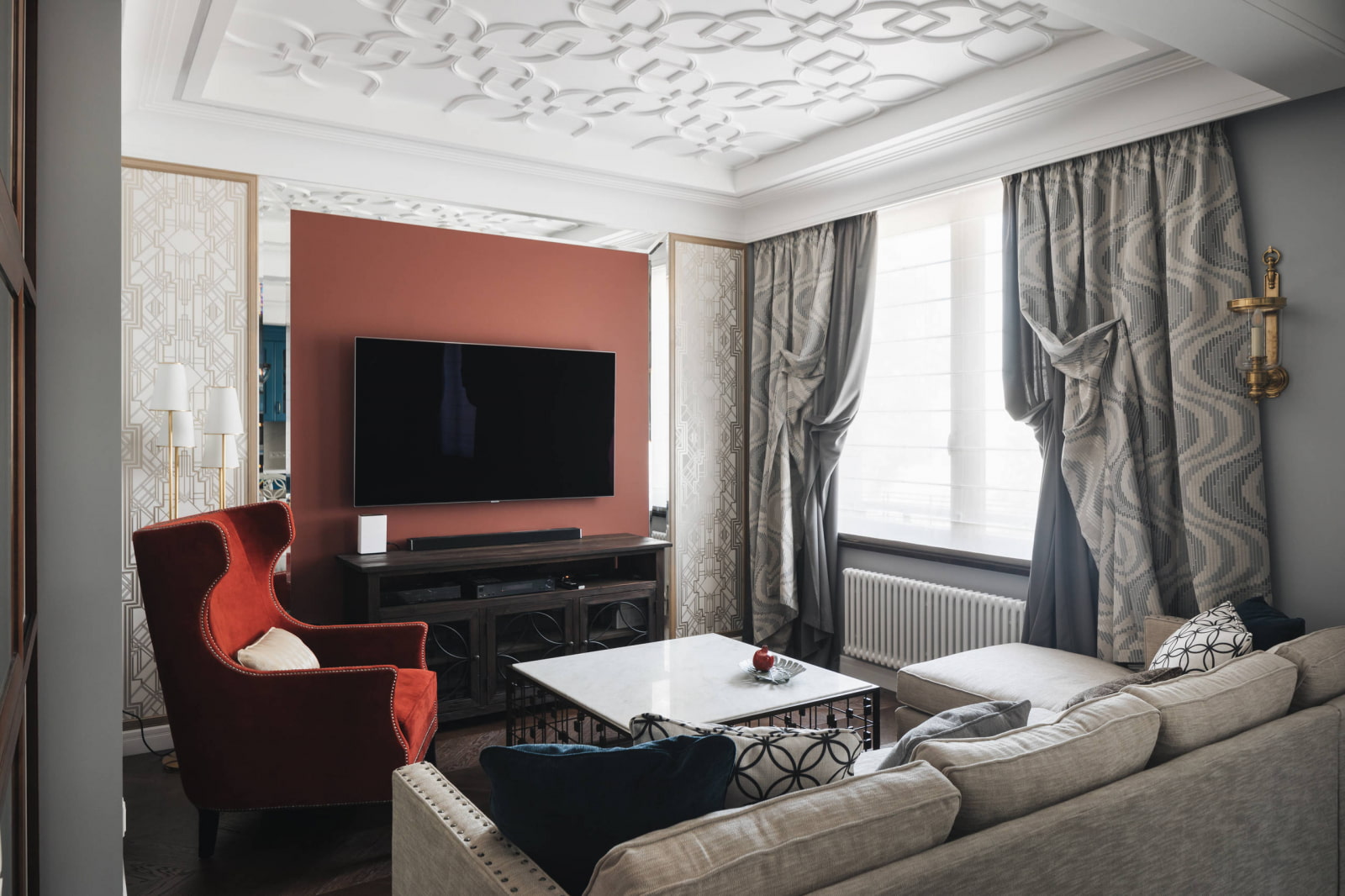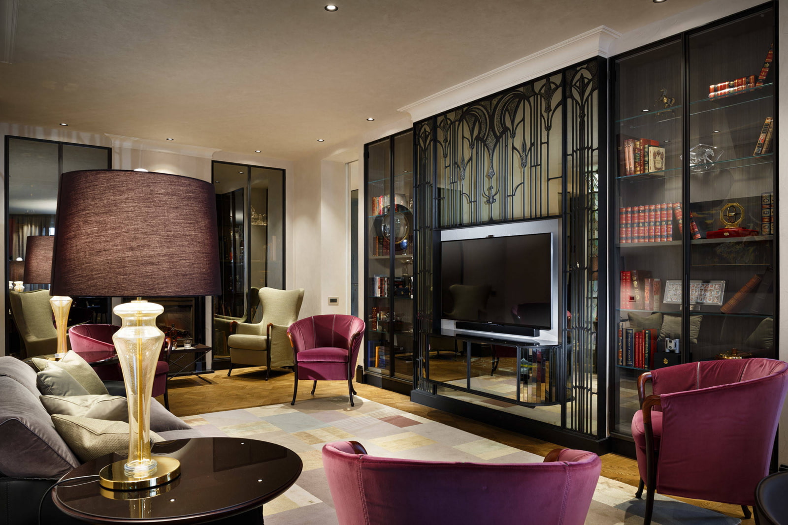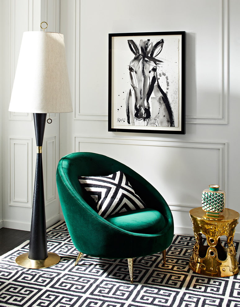 The photo shows a modern art deco living room with a refined and cozy atmosphere, thought out to the smallest detail.