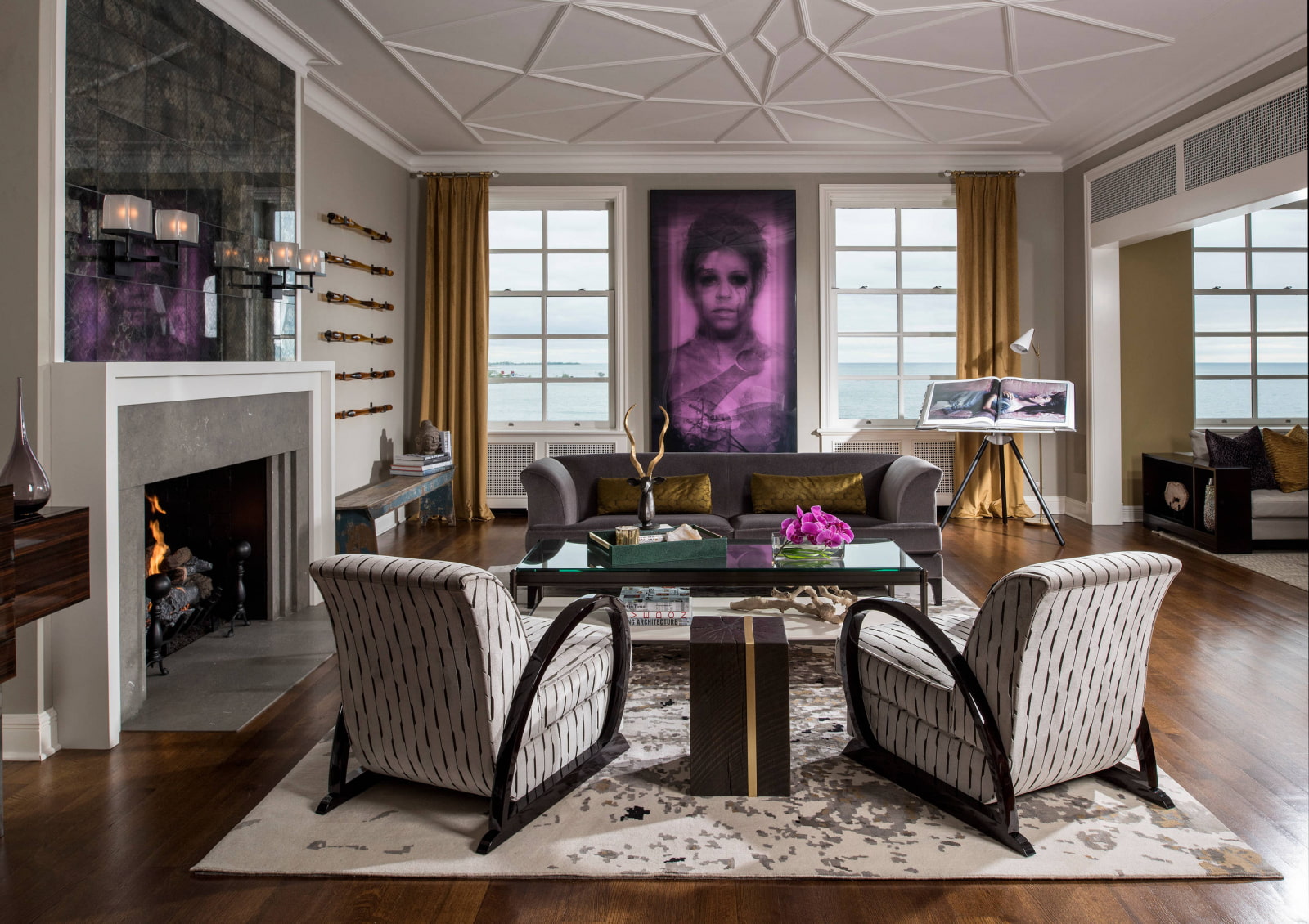 Pictured is an art deco living room with a fireplace and a purple sofa group. Decorating the wall with mirrors makes the space visually wider and richer.