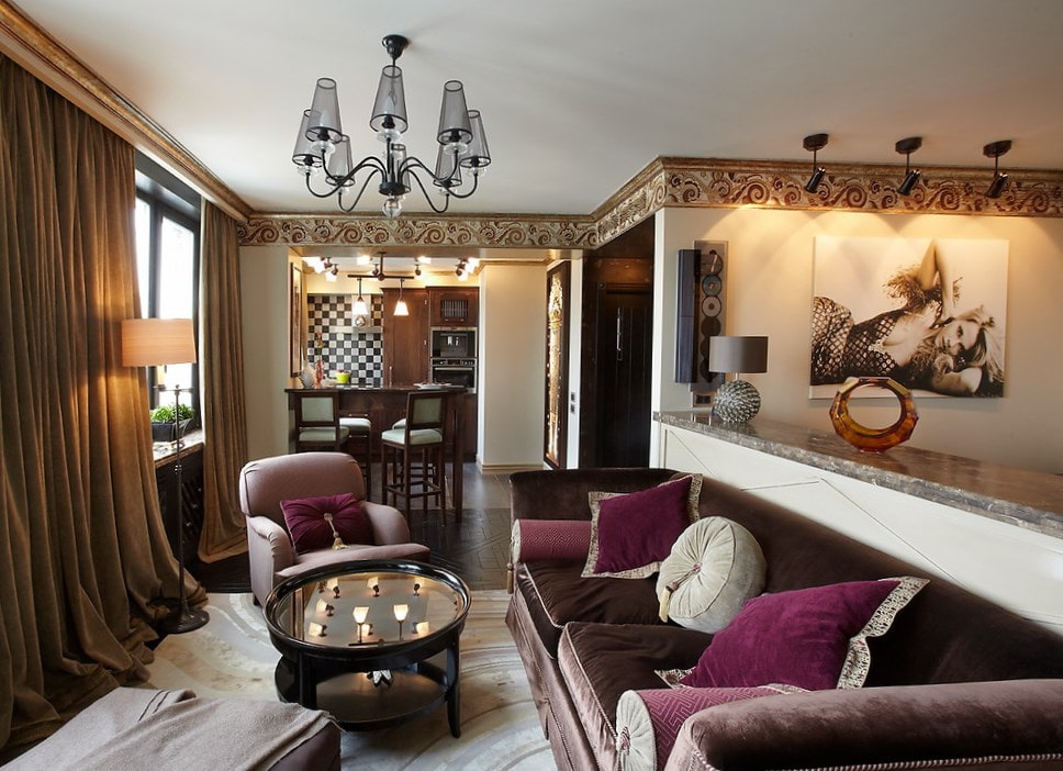 The art deco style in the living room interior presupposes the presence of multilevel lighting, which means that massive palace-style chandeliers, bunches of pendant lamps, and spots can be the central light sources. For local lighting, wall sconces are suitable, and decorative light can be represented by linear lighting hidden under ceiling cornices and furniture.