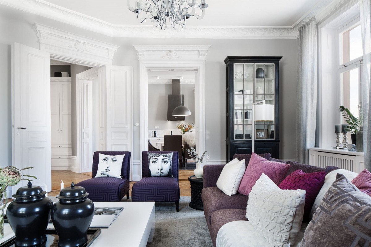 Pictured is a living room in gray tones with gold and purple accents.