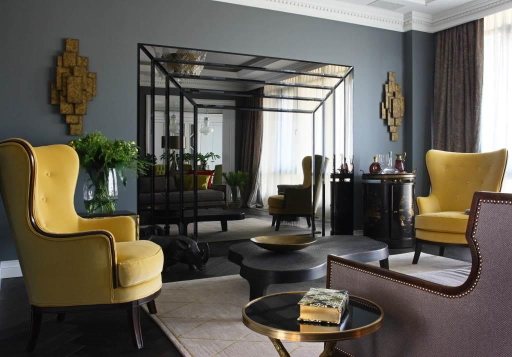The photo shows an elite interior in the art deco style with rich furniture of rounded shapes and many reflective surfaces.