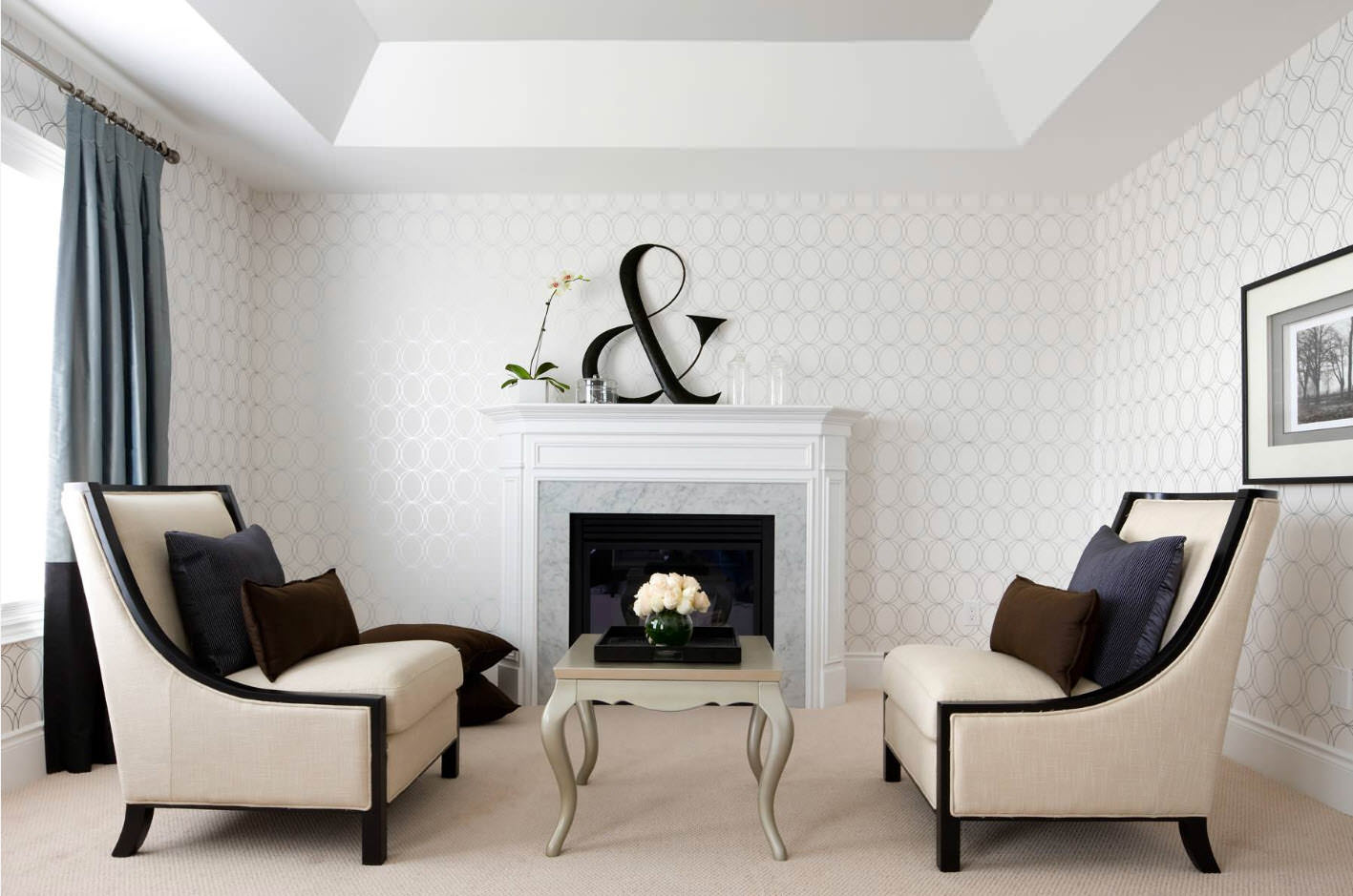 Photo of a living room with white and black and white wallpaper
