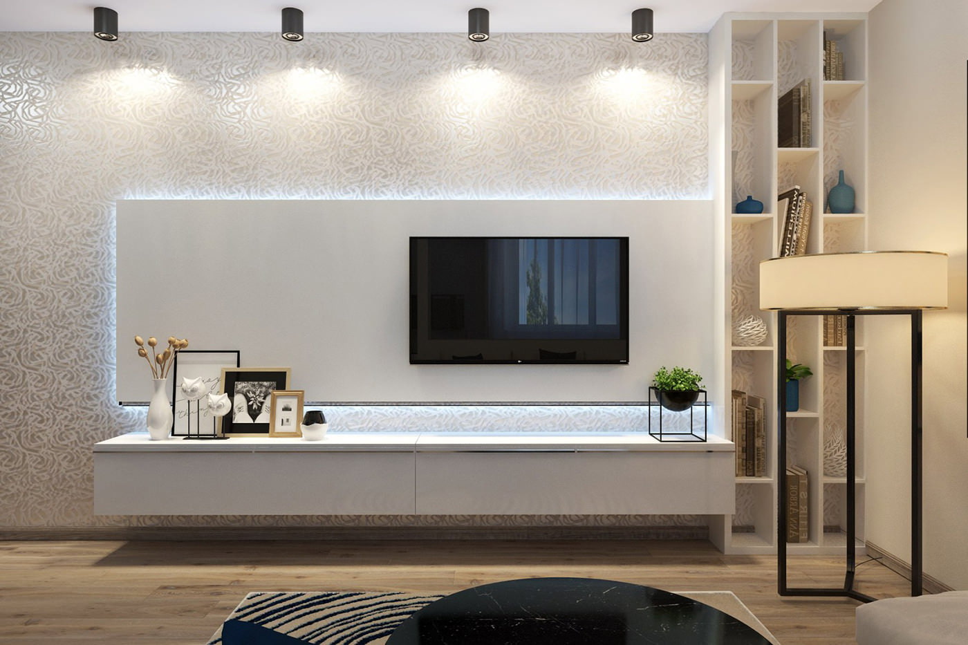 Photo 2. White brick-like wallpaper in the living room design was used to accentuate the TV area.