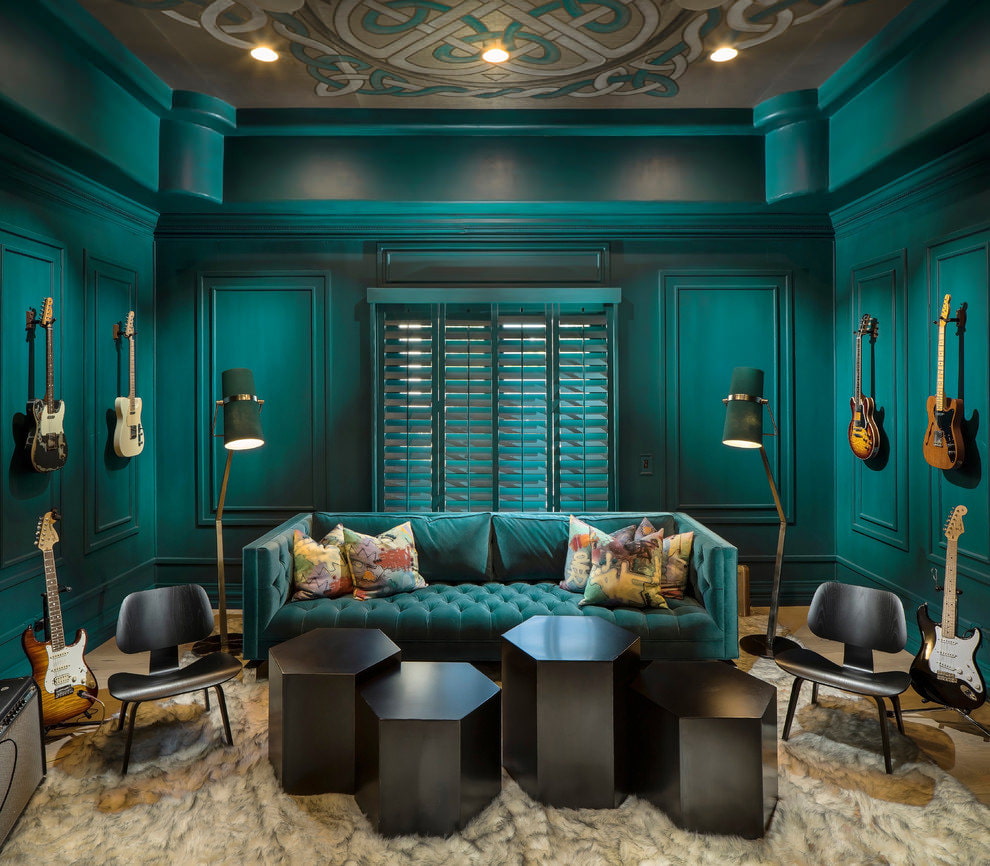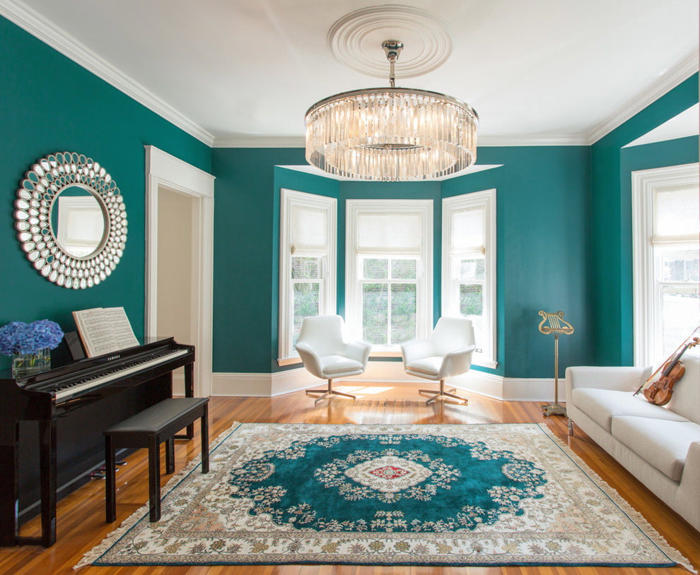 An interesting solution would be a colored floor or ceiling. A plus will be the presence of a high ceiling, this will create the impression of infinity and freedom. The floor covering can be not only carpet, but also carpet with intricate patterns. The deep dark turquoise color of the carpet will elegantly fit into almost any interior.