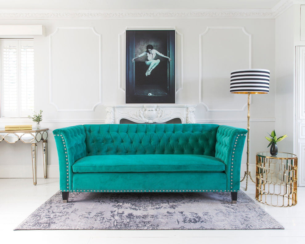 Sofa deep turquoise color, made of dense velvet or jacquard, will take pride of place in the living room and will become the main object of attention.