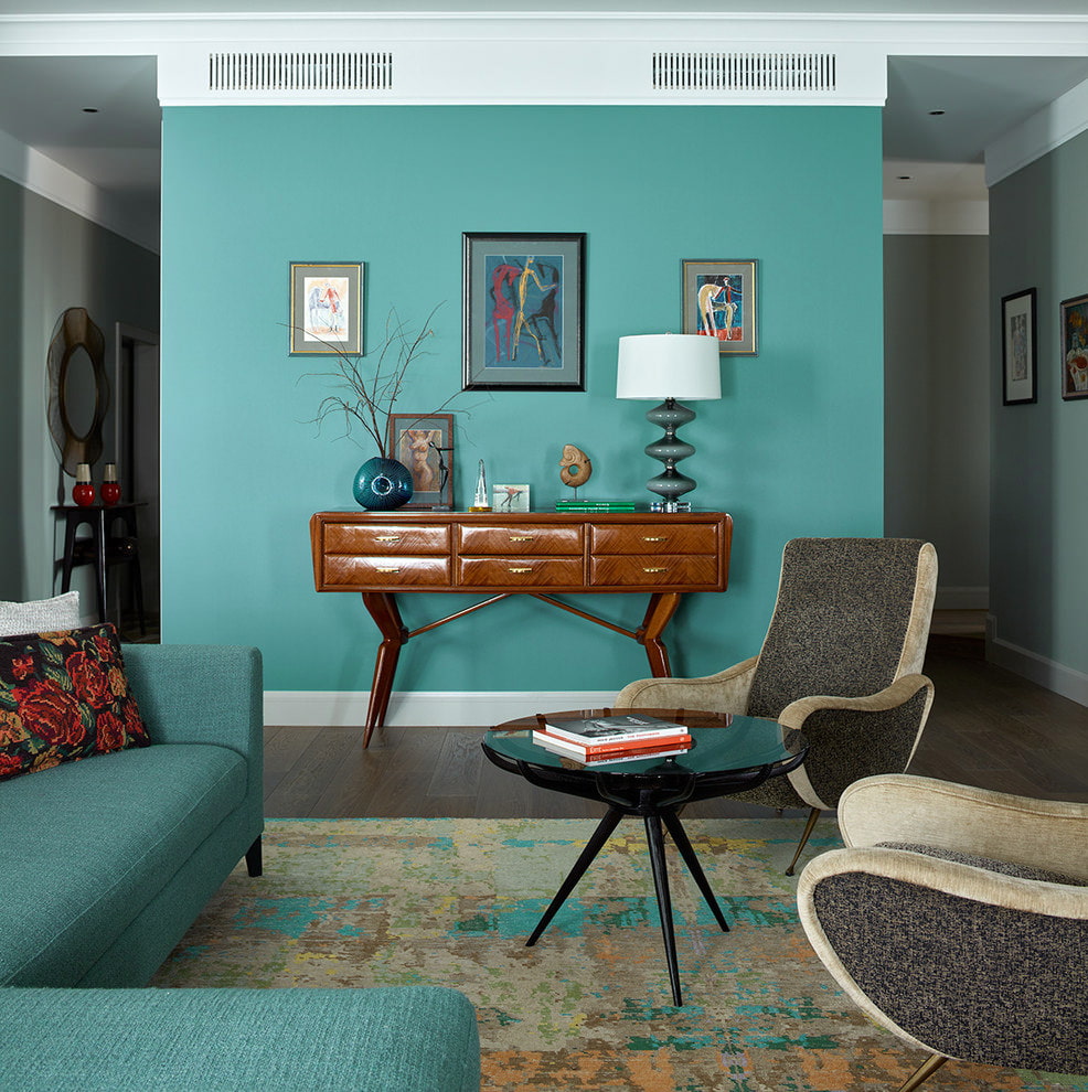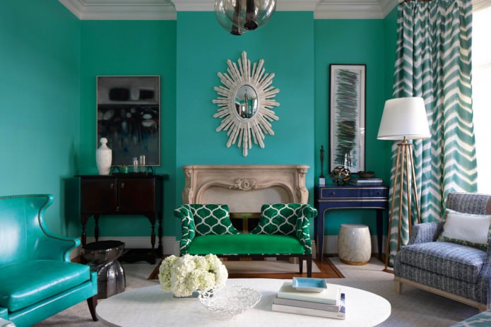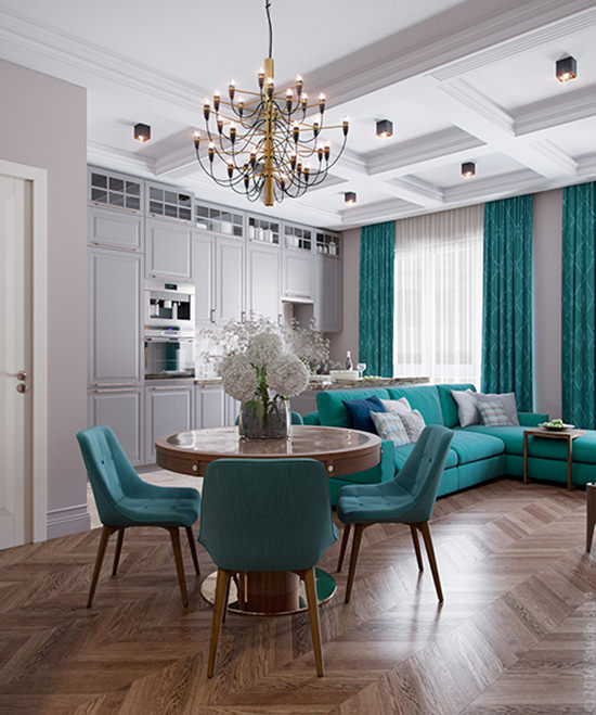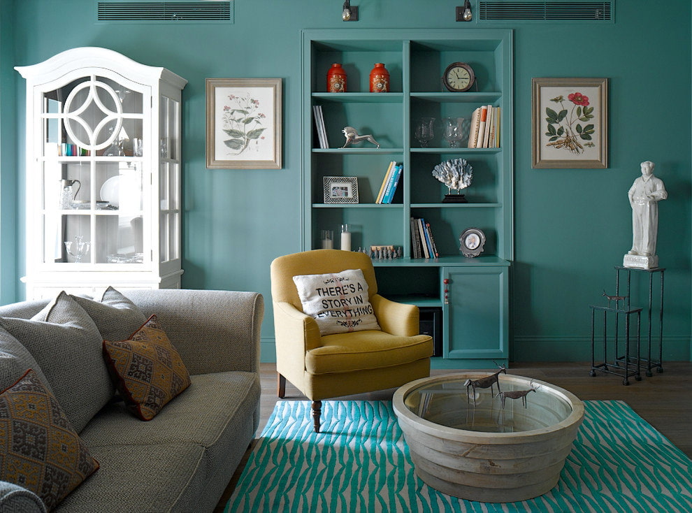 On the picture the interior of the living room is presented with different combinations of turquoise, from a calm to a more saturated and deep shade.