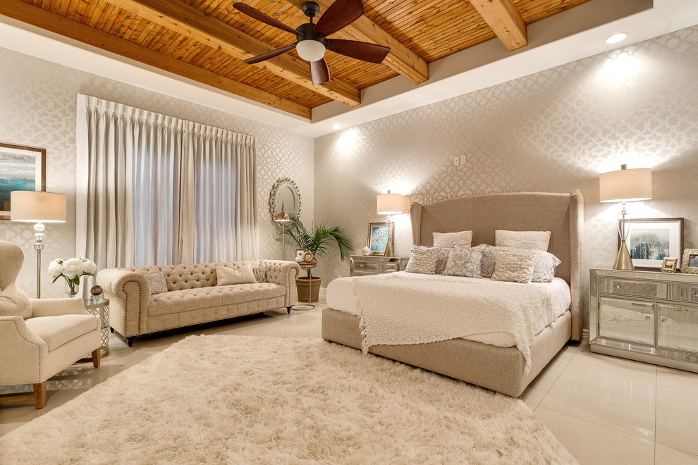 In the bedroom, using a compact sofa, you can create a cozy seating area: put a coffee table, an ottoman and a bookcase next to it. Soft upholstery is preferable: velor or velvet in soft, pastel colors.This space is ideal for relaxing after a hard day at work.
