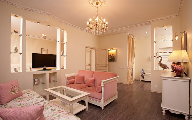 Pink is a combination of red and white, an alliance of purity and passion. Affection, warmth, attraction, gentle ardor come to mind when they talk about the color pink. But the pink tone also has completely different, reverse sides with opposite characteristics, depending on the addition of one or another gamut, changes in the proportions of the colors being combined. The assessment, acceptance and opinion about the pink interior of the living room depend on them.