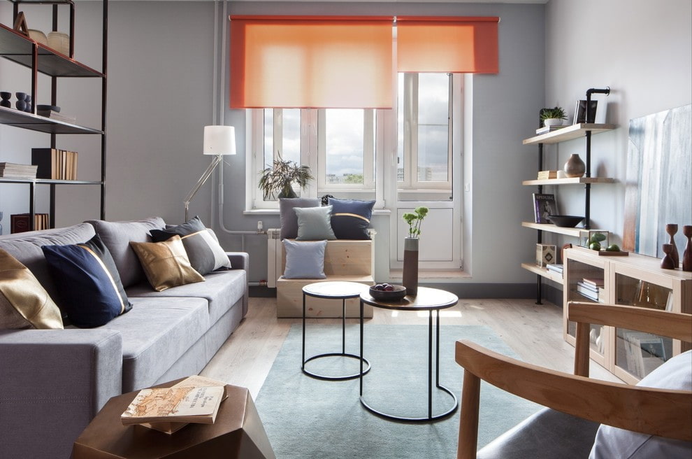 In the photo, the hall is in gray colors with orange roller blinds on the window.