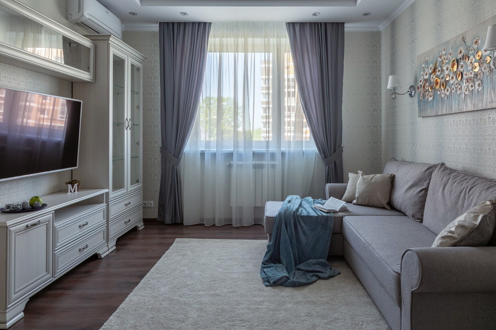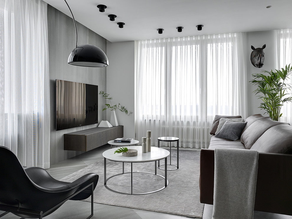 Gray furniture will not overload the living room and at the same time make it elegant. White or black furnishings will perfectly fit into the design. As a stylish accessory, the monochrome room can also be complemented with a red armchair or other bright element.