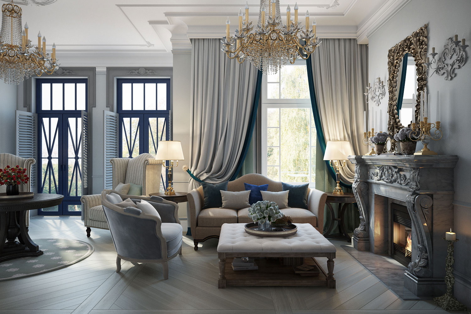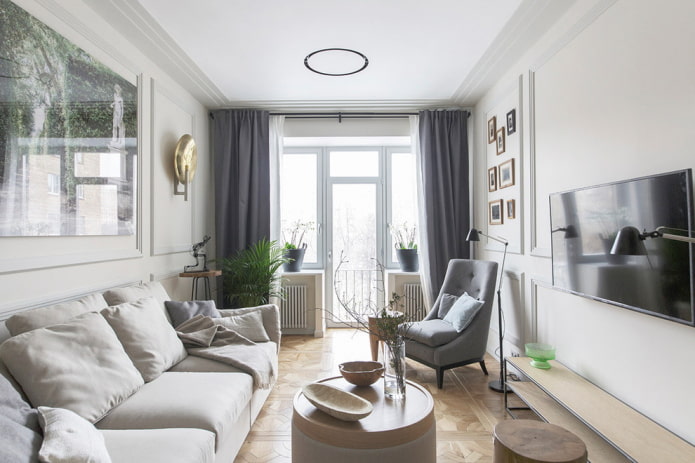 For neoclassicism, the use of elegant gray-beige colors is assumed. To create a truly aristocratic atmosphere, the living room is decorated with bronze decor, crystal lamps and furniture with golden or silver patina.