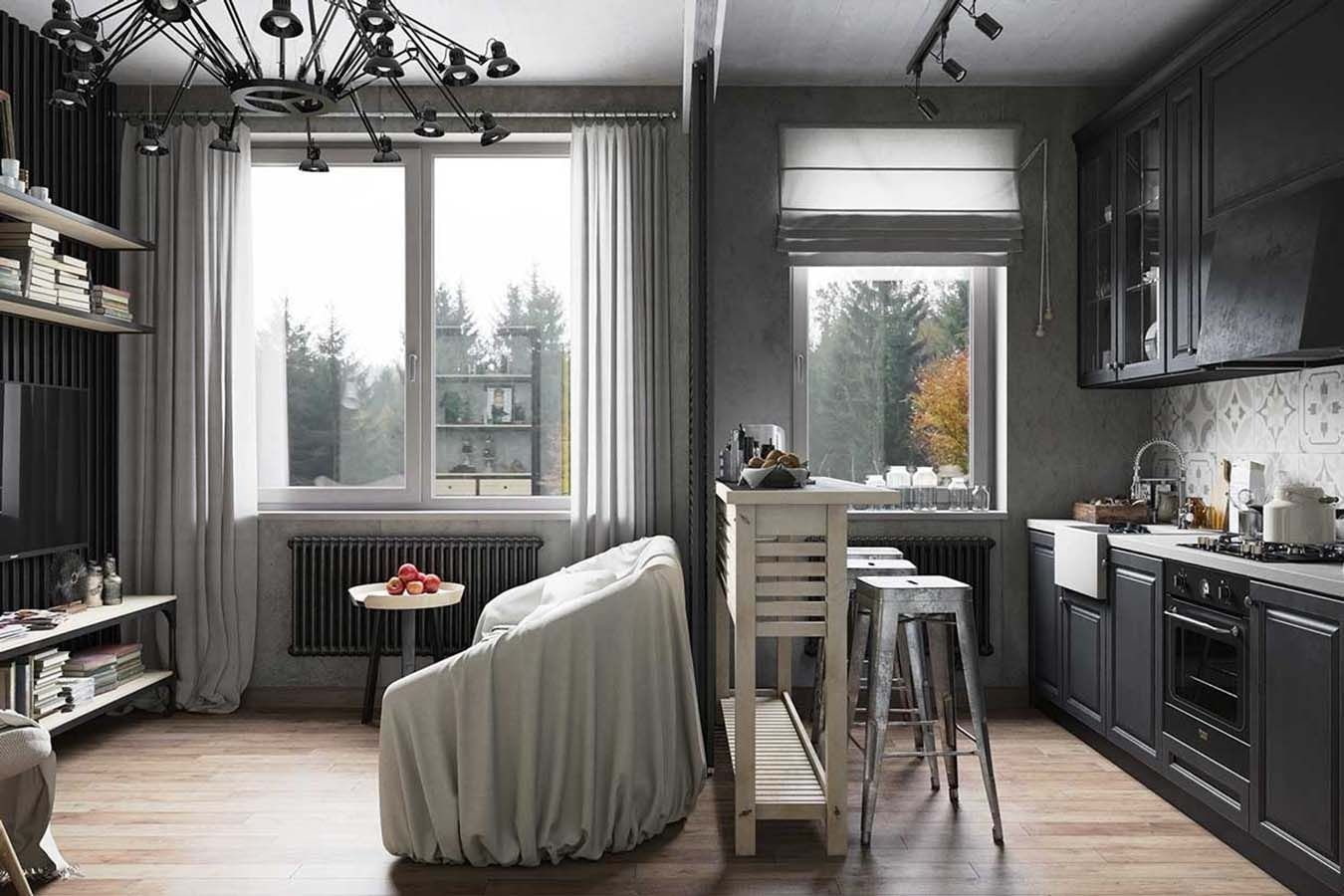 Gray is no less popular in the industrial loft style. Concrete, brick or plastered surfaces work well with light gray curtains and a mouse-colored sofa.