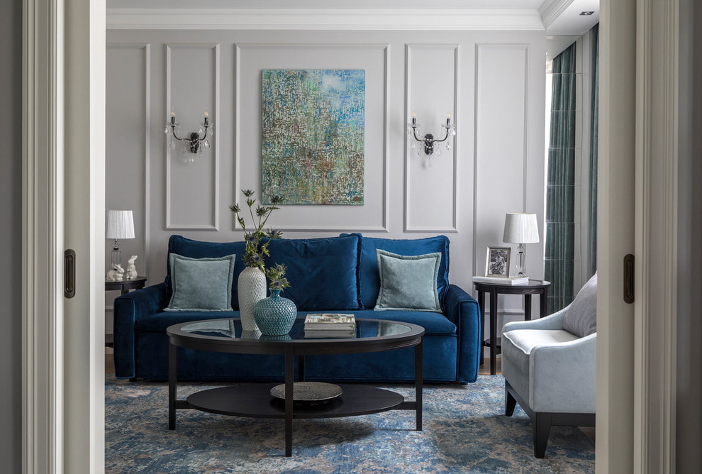 Cool blue color, fills the living room with pleasant freshness and draws attention to itself. Silver or smoky colors will look good in combination with a delicate cornflower blue and blue hue.
