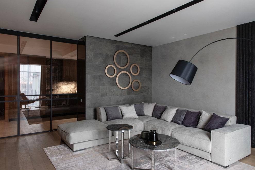 The hall in warm gray tones looks truly luxurious and noble, while the living room, decorated in cool steel colors, can evoke associations with a factory premises.