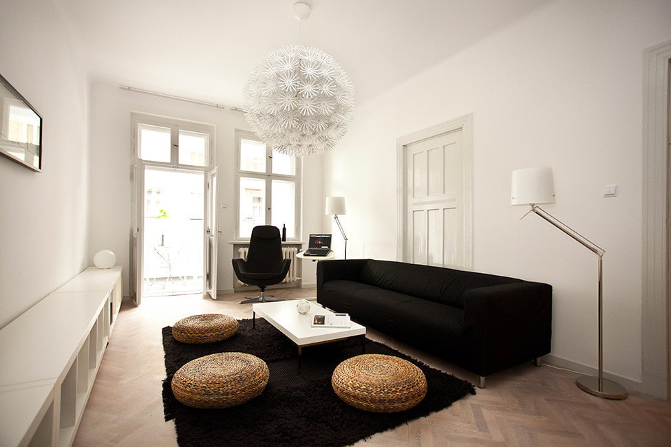 The traditional solution in a black and white living room is a dark floor that can be decorated with a bright rug or other floor accessories. Light materials are also used for decoration. Whitewashed laminate, parquet or tile will create an unusual contrast to the pieces of furniture.