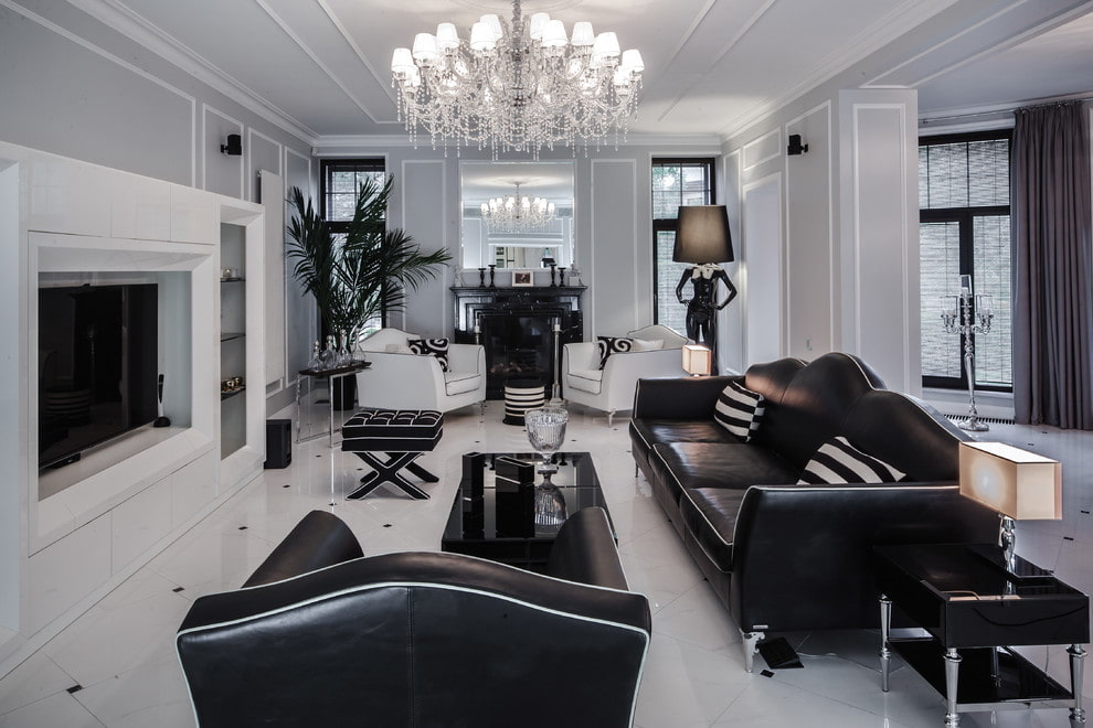 Art Deco interiors are often built on a combined contrasting combination that gives the room a stylish and respectable look. In the design of the floor, it is appropriate to use black, white marble or glossy tiles laid out in a checkerboard pattern. The black and white room is decorated with status furniture with golden or silver details and complemented with rare and valuable accessories.