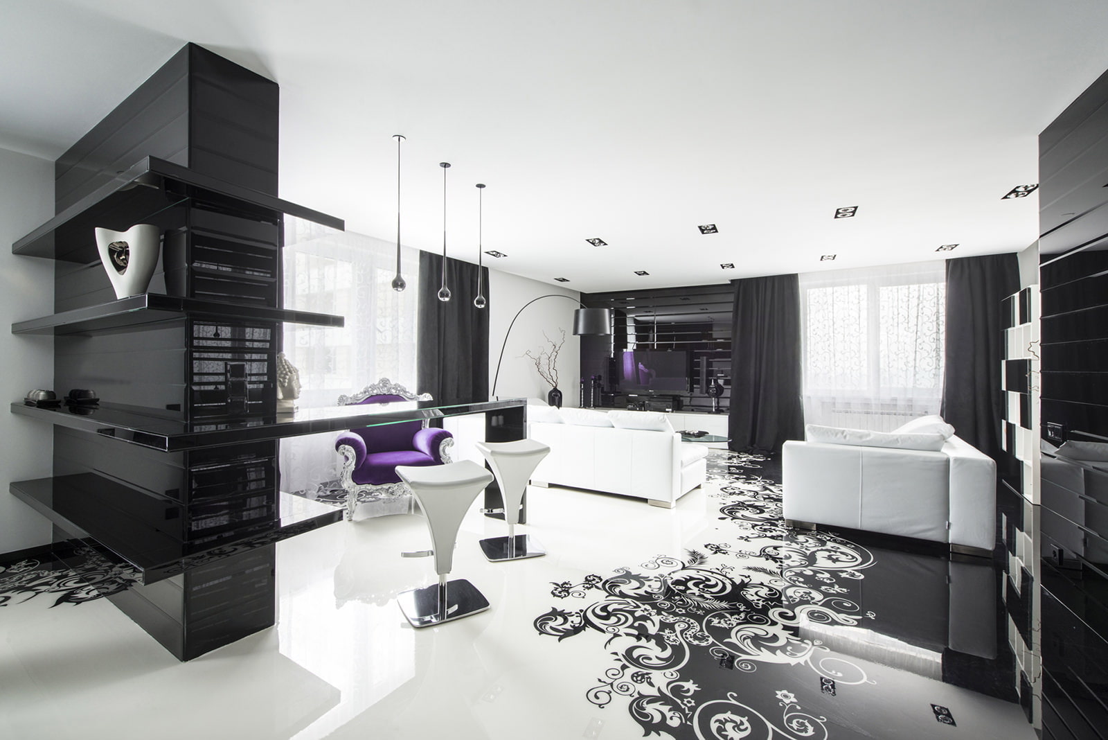 A very stylish decoration option is the use of black and white carpets stylized as zebra or geometric patterns.