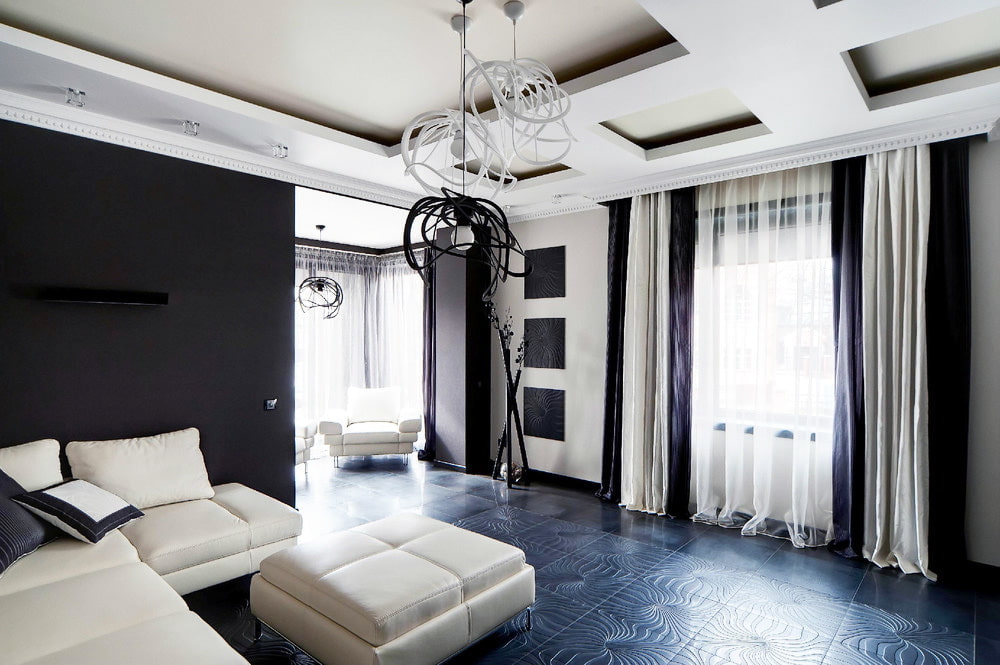 In the living room in black and white, the use of black curtains is appropriate. Also, the windows are decorated with light curtains with patterns. To prevent the interior from looking chaotic, it is recommended to choose larger prints.