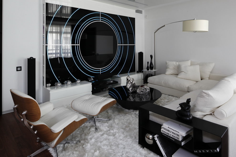 In the photo there is a living room with a black and white interior made in high-tech style.