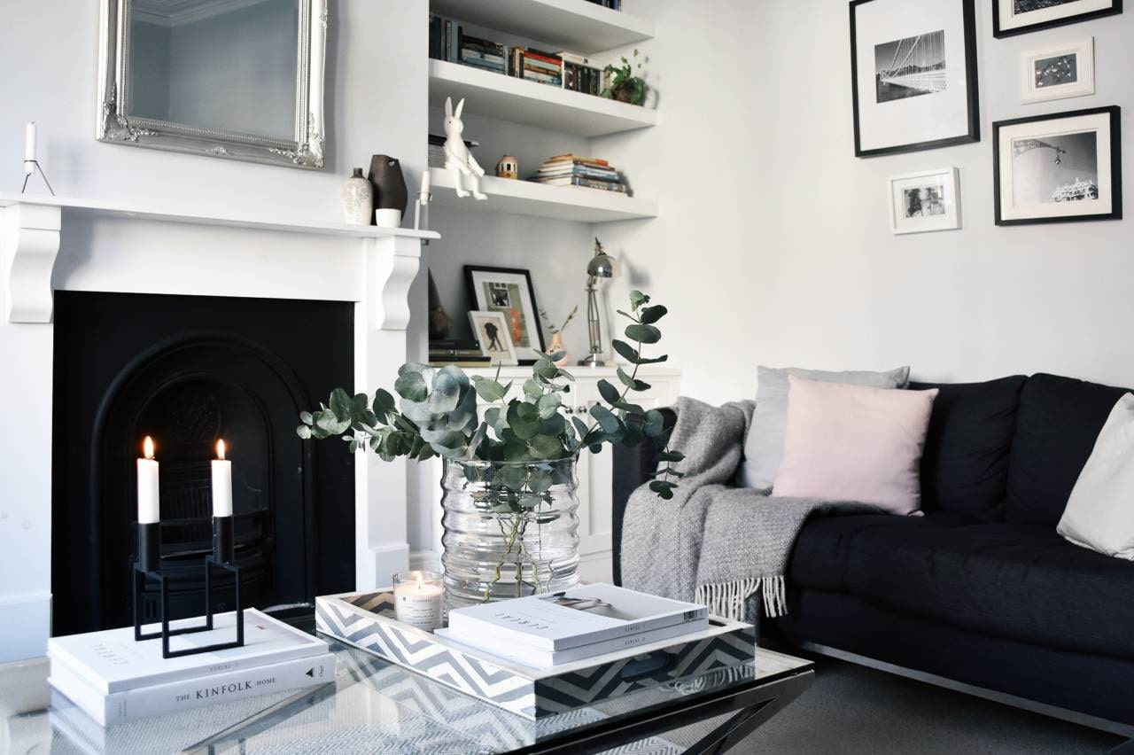 The photo shows a black and white living room interior with a fireplace, tiled with light masonry.