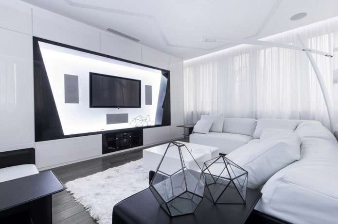 It is common for high-tech style to dominate white, and black to act as separate elements in the form of lighting fixtures, a sofa, a coffee table or curtains.
