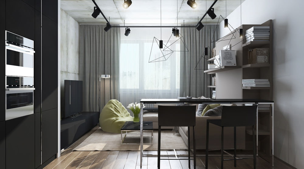 The role of decorative elements is performed by black household appliances built into the wardrobes - they have something in common in color and design with the TV panel on the wall in the living room. The working area of the kitchen is equipped with lighting. The line of kitchen cabinets ends with a wooden shelf turned towards the living room - it can be used to store books and decor items.