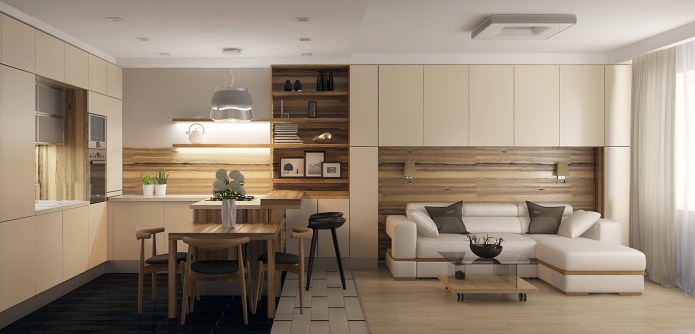 Kitchen combined with a living room in the design of an apartment of 56 sq. m.