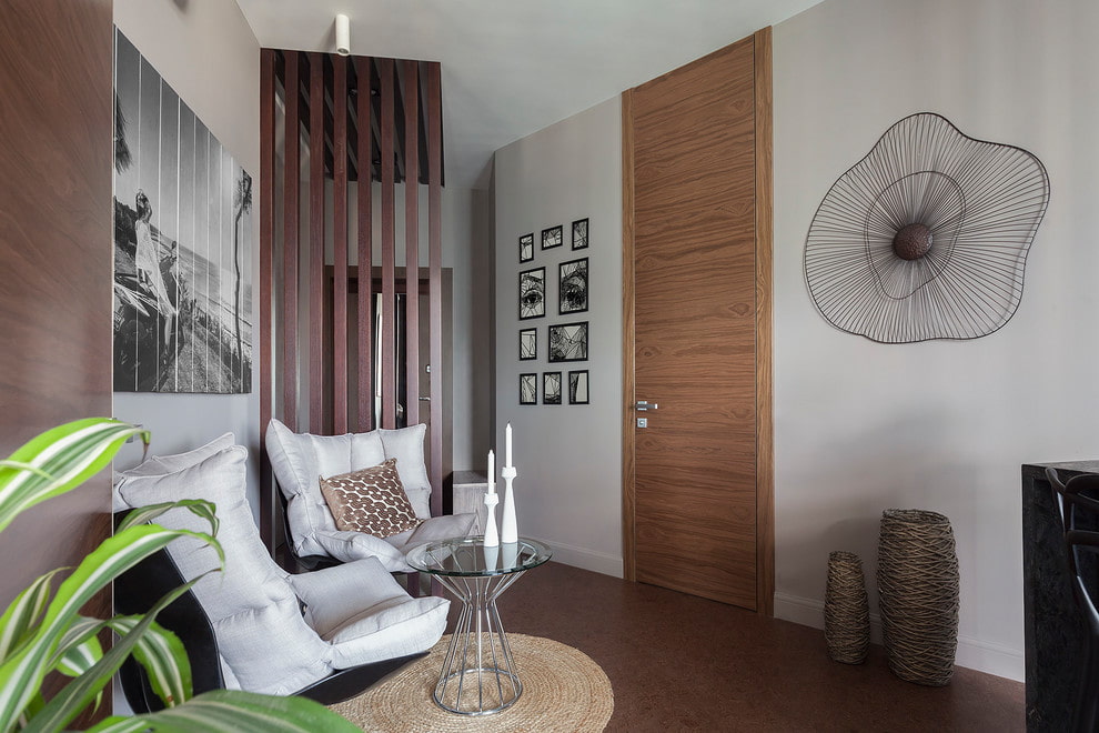 The photo shows a small living room with a wenge-colored single-leaf wooden door.