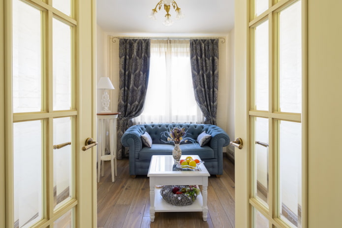 In the photo there is a Provence style living room with a light swing door combined with glass.