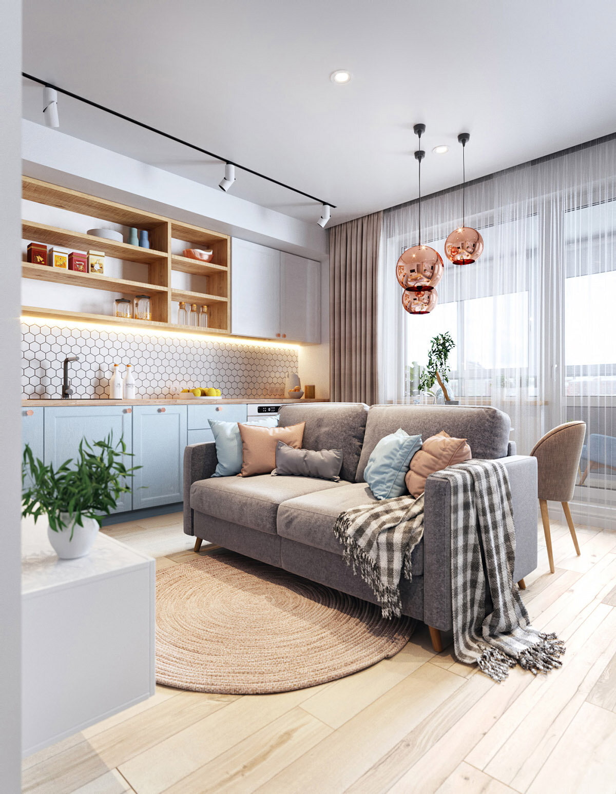 Let's start with the windows: if the living room has a permanent place to sleep, blackouts come in handy. MAYGULL curtains are suitable: there are both colored and neutral.
