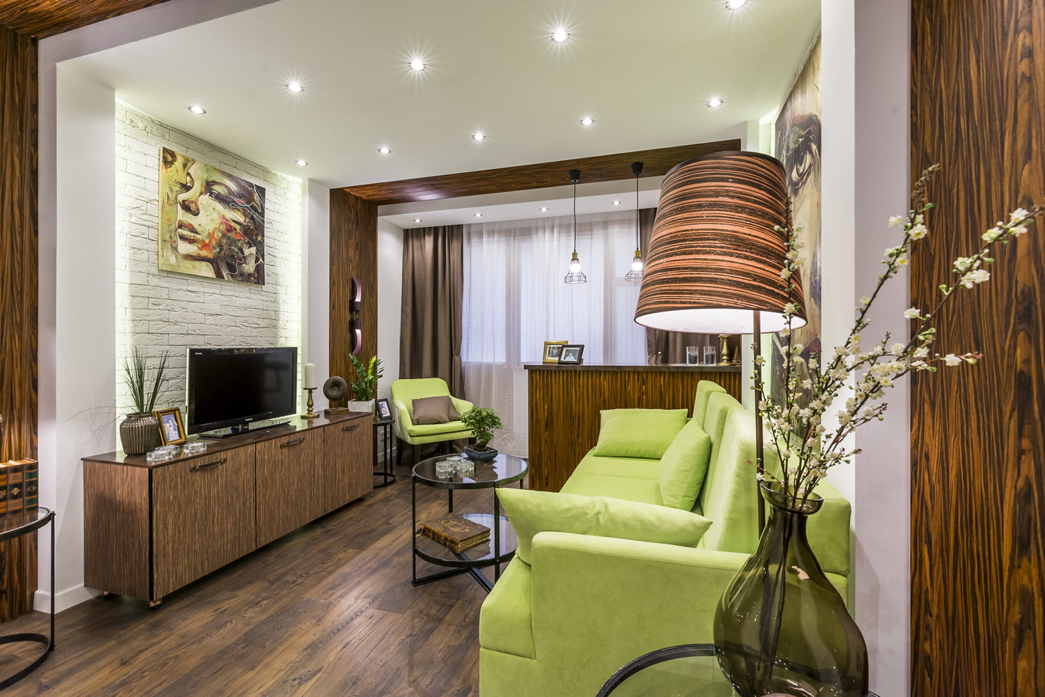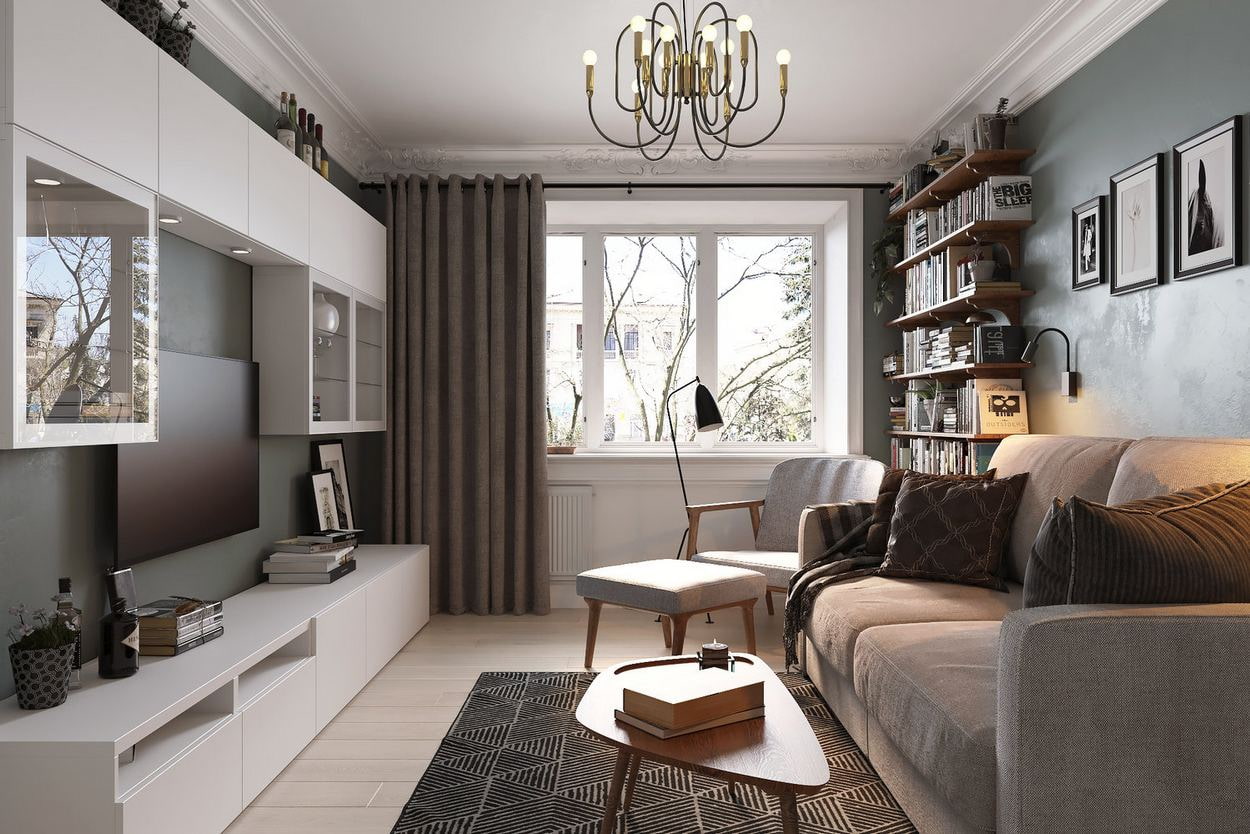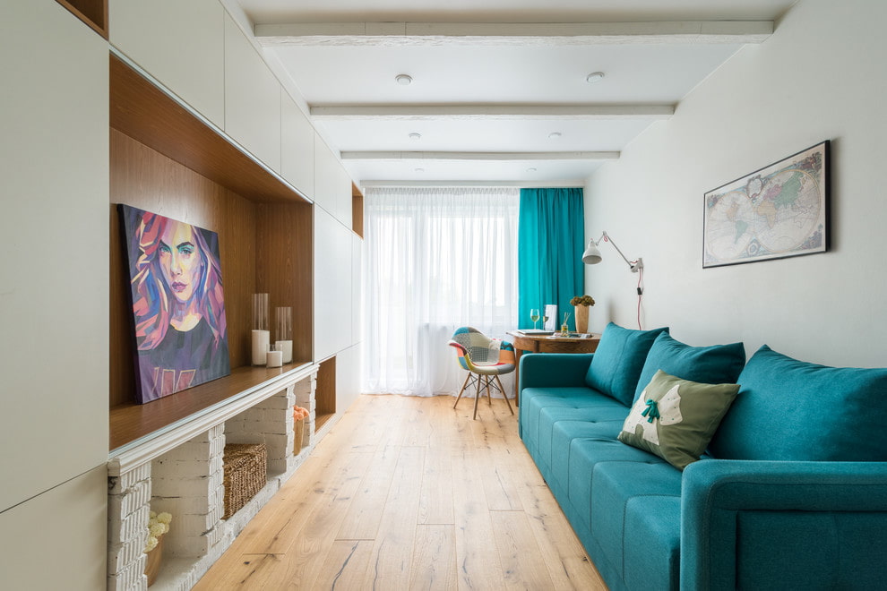 For an elongated space, choose a linear arrangement of furniture. A sofa is placed near one long wall, and a parallel plane is complemented with modular cabinets and a TV.