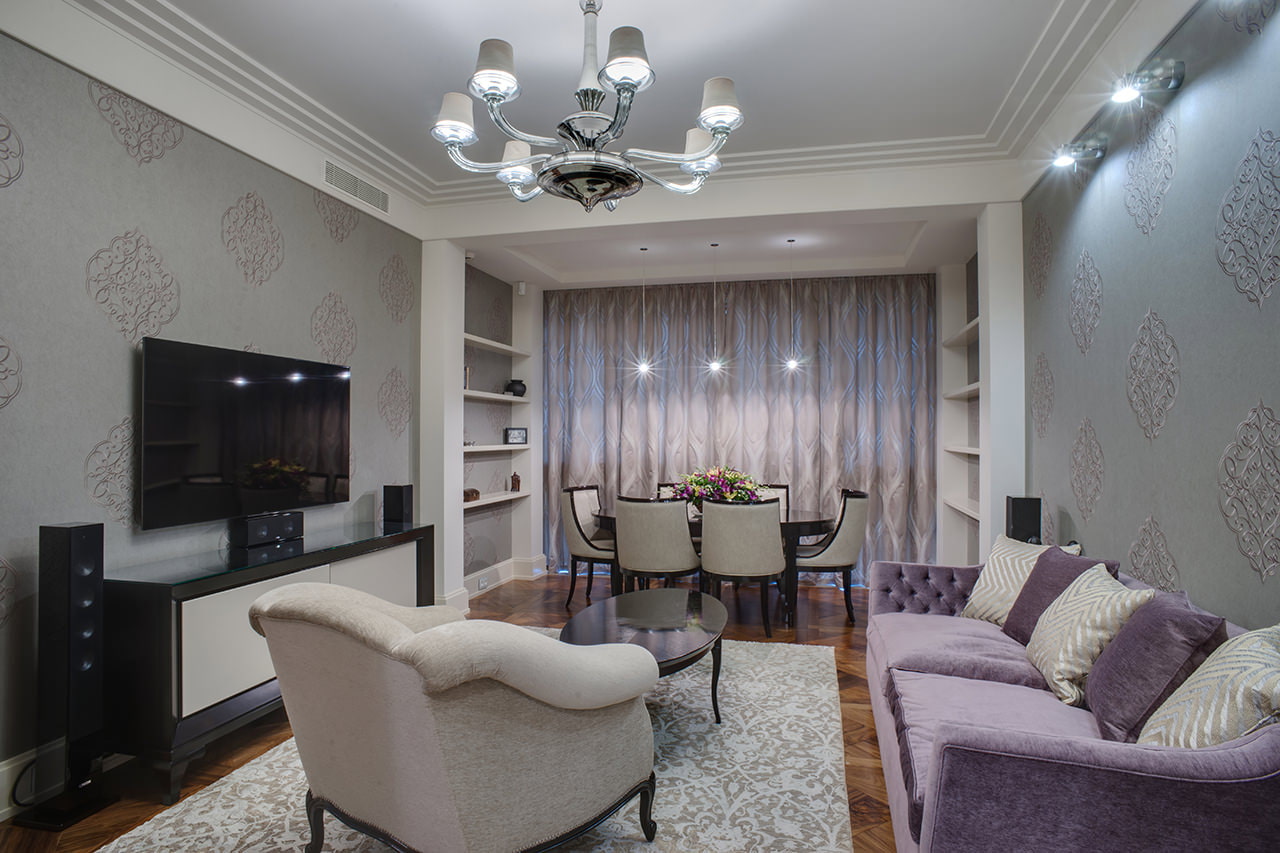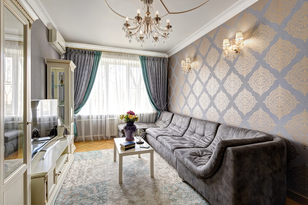 In the photo there is a recreation area in the Khrushchev apartment, highlighted with patterned gray wallpaper.