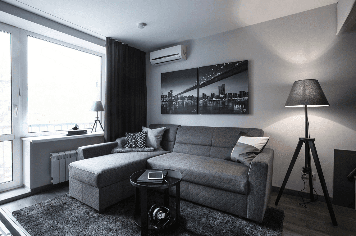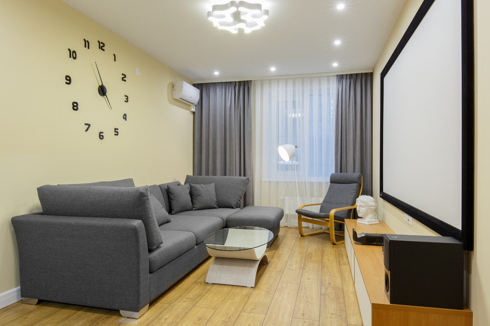 In the photo there is a living room in a Khrushchev, made in gray tones with the addition of white and beige.