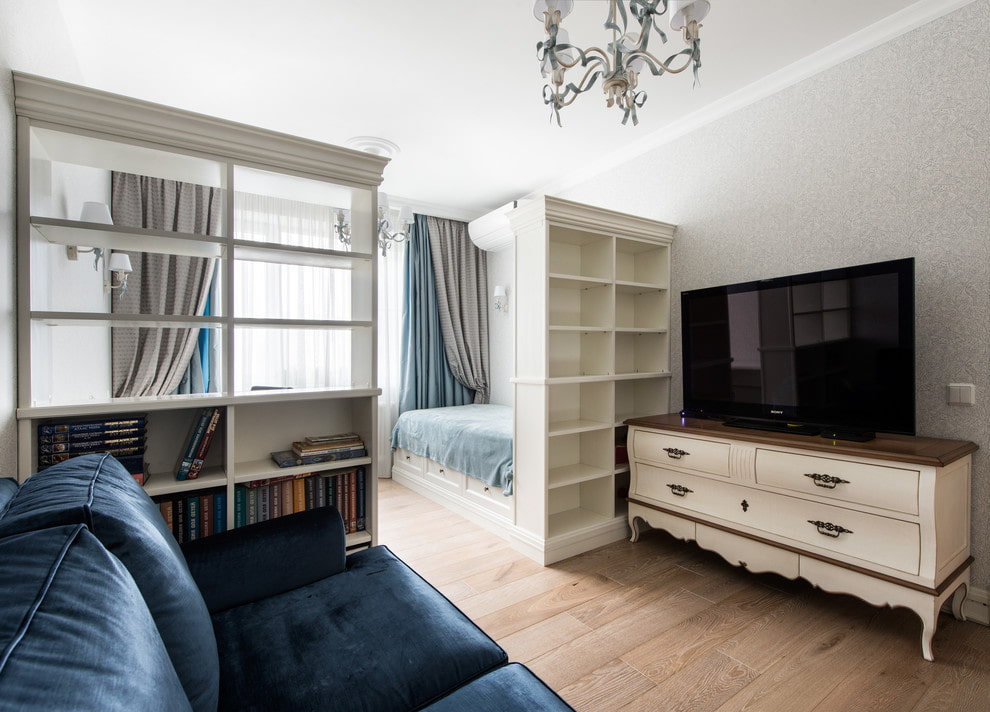 It is better to place a place with a bed away from the doorway and separate this segment with a screen, curtains, a rack or a plasterboard partition. Another good zoning option would be the use of different flooring or the construction of a podium. The installation of sliding systems will help to isolate the sleeping place.