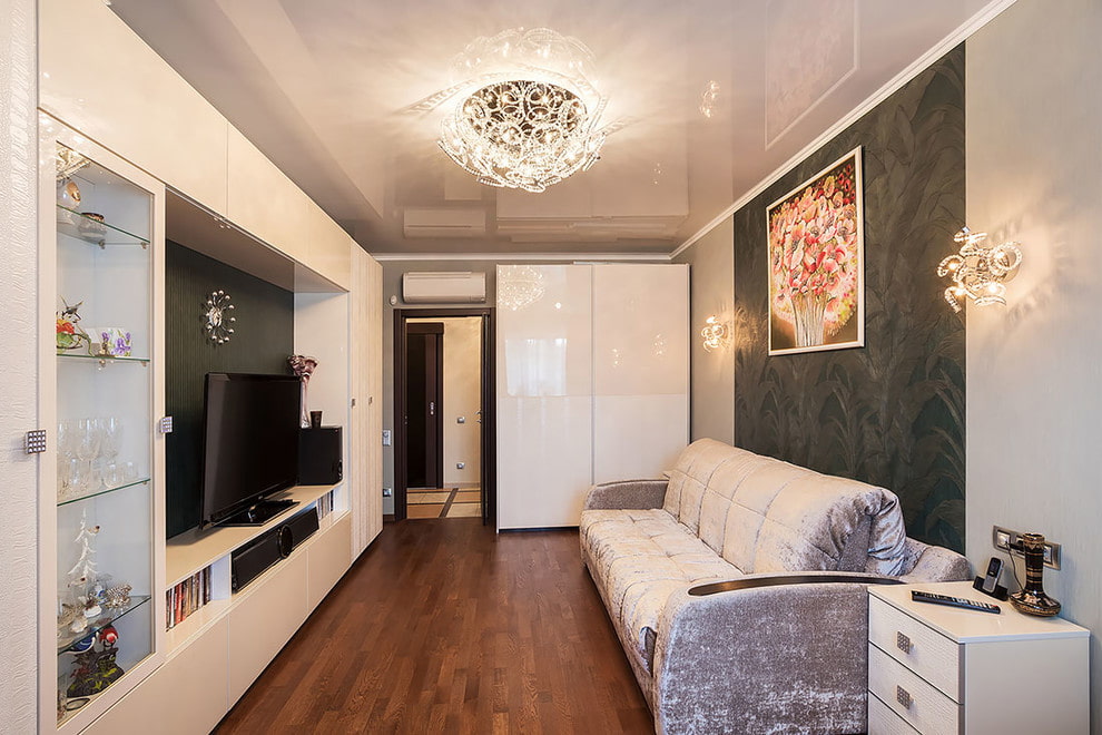 In the interior of the hall, the use of plaster, painting, installation of a suspended or stretched canvas is popular. For a small room in a Khrushchev with a low ceiling, a complex multi-level structure is not suitable. Best of all, a covering in the form of a glossy film that reflects light and visually expands the space will look best on the ceiling in the living room.