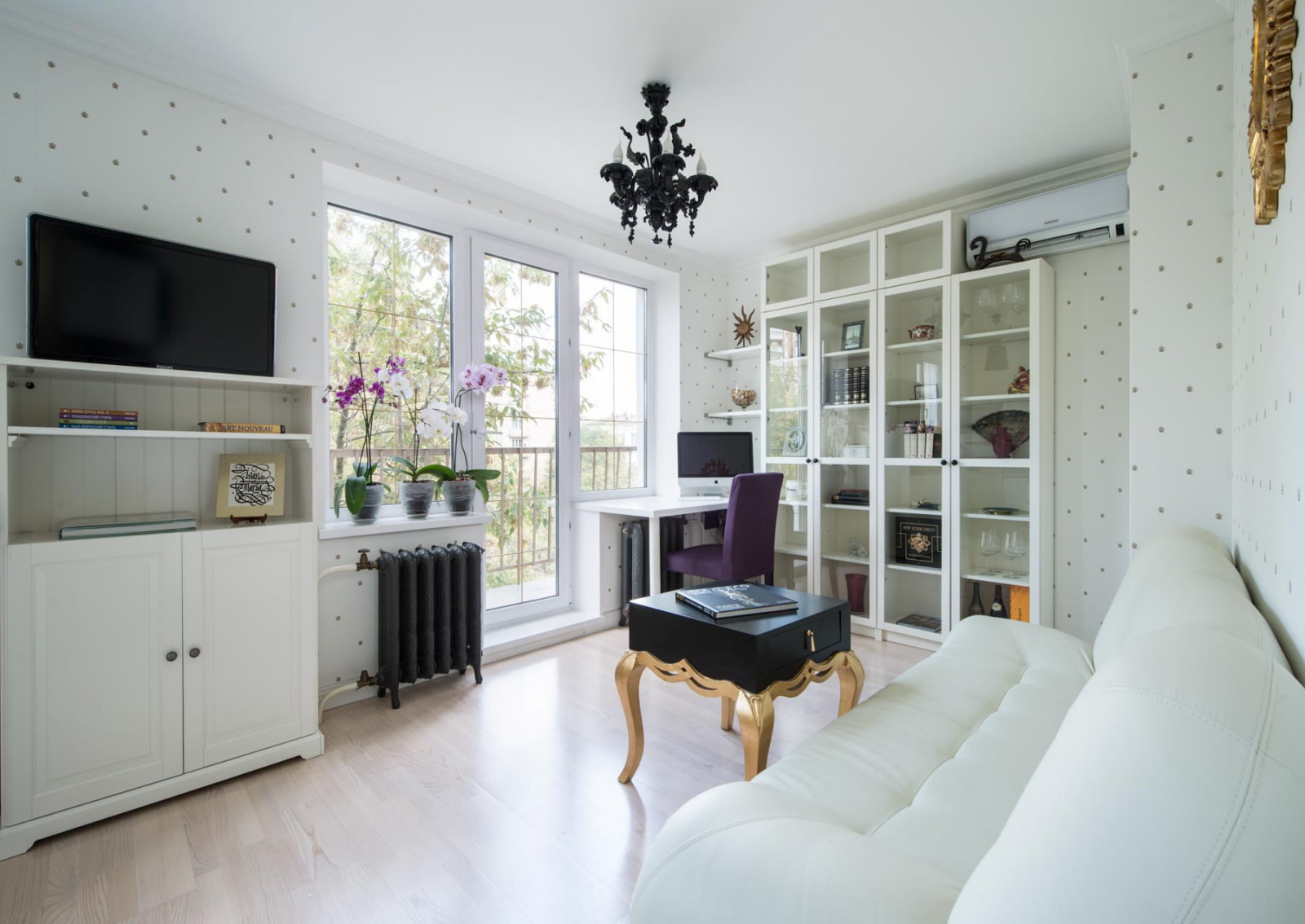 The most advantageous option for the design of a small living room in Khrushchev.White shades allow you to visually enlarge the room, add freshness and additional radiance to the interior. Any tone is suitable for a harmonious combination with this color. It would be appropriate to dilute the white room with accents in green, yellow, pink or other colorful tones.
