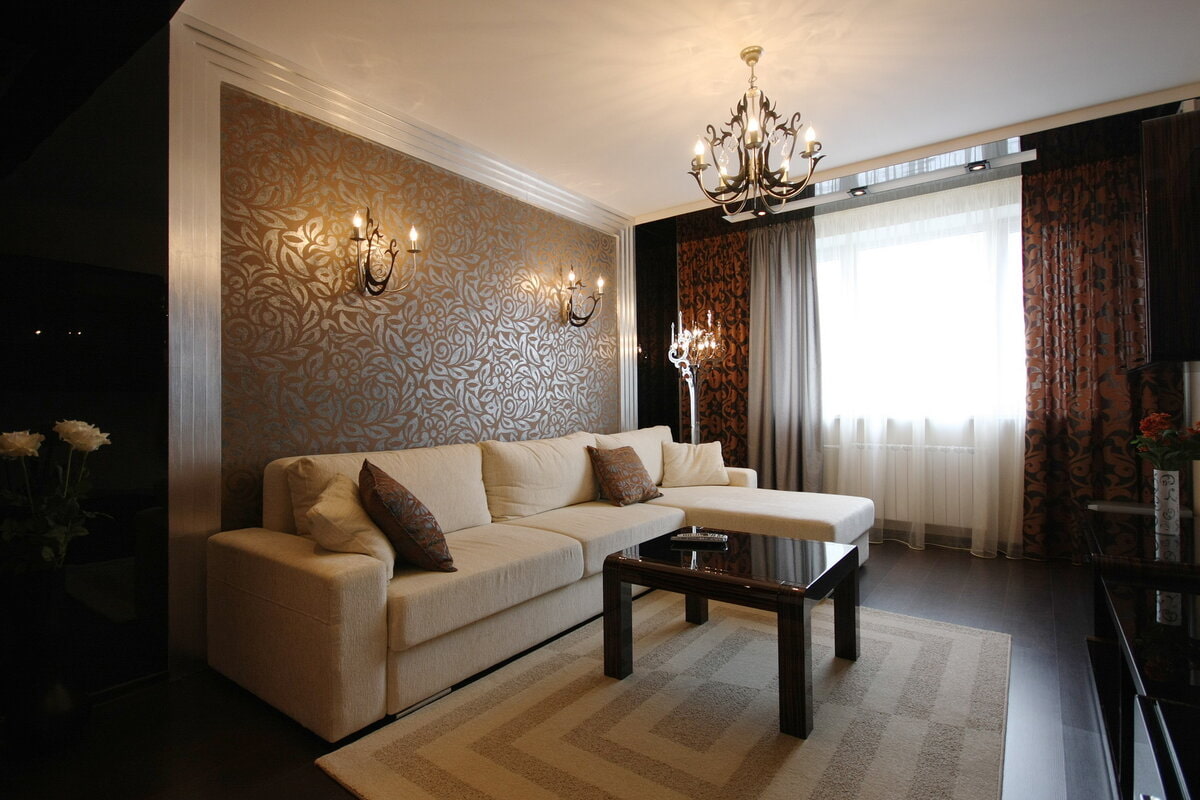 In order not to make the rectangular room disproportionate and lengthen the space even more, it is not advisable to arrange furniture near one oblong wall. The interior will look visually more balanced if combined and divided horizontally in the wall decoration. For example, the top of the plane is painted and the bottom is pasted over with patterned wallpaper. A warm tint palette will help expand the rectangular long hall.
