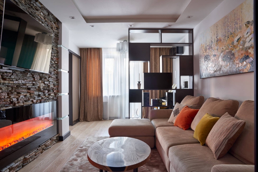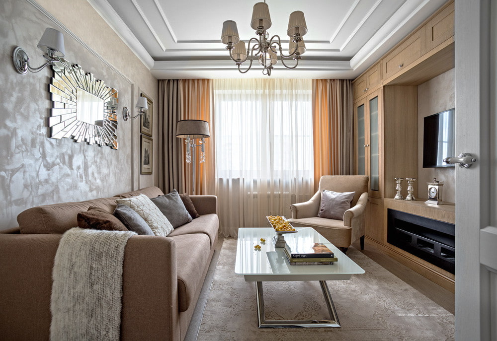 A small living room in the Khrushchev apartment remains a checkpoint without redevelopment. Arrangement of furniture in such a room should be carried out in such a way that objects do not interfere with free movement and do not block the passage. For a walk-through hall, an excellent solution would be the choice of a more restrained style direction and the installation of transforming furniture elements.