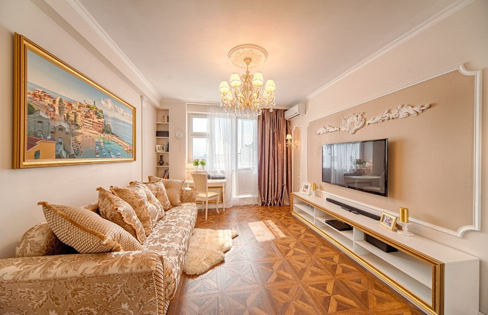 A calm and comfortable design of a living room in a Khrushchev can be achieved through flooring in the form of parquet boards, laminate or carpet. A reliable board made of natural wood will not only decorate the interior of the hall, but will also serve for quite a long time.
