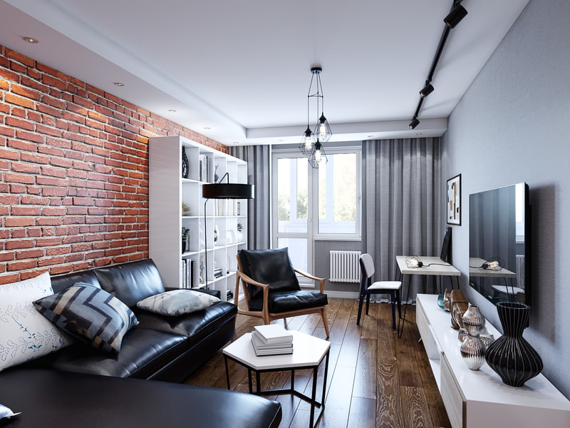 With the help of wall cladding, it is possible to make zoning of the room, as well as to achieve a visual change in its configuration. For example, one accent plane decorated with brickwork, wood panels or photo wallpaper will help to make a narrow and elongated living room in a Khrushchev more even and spacious.