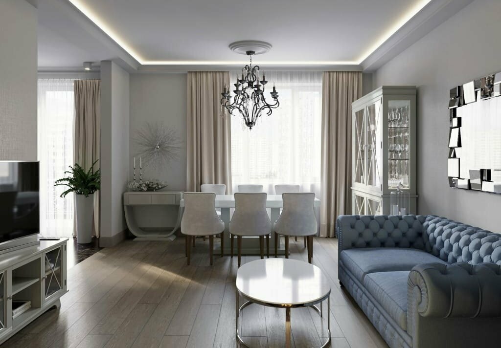 The photo shows the design of a rectangular living room in a Khrushchev building in the classic style.