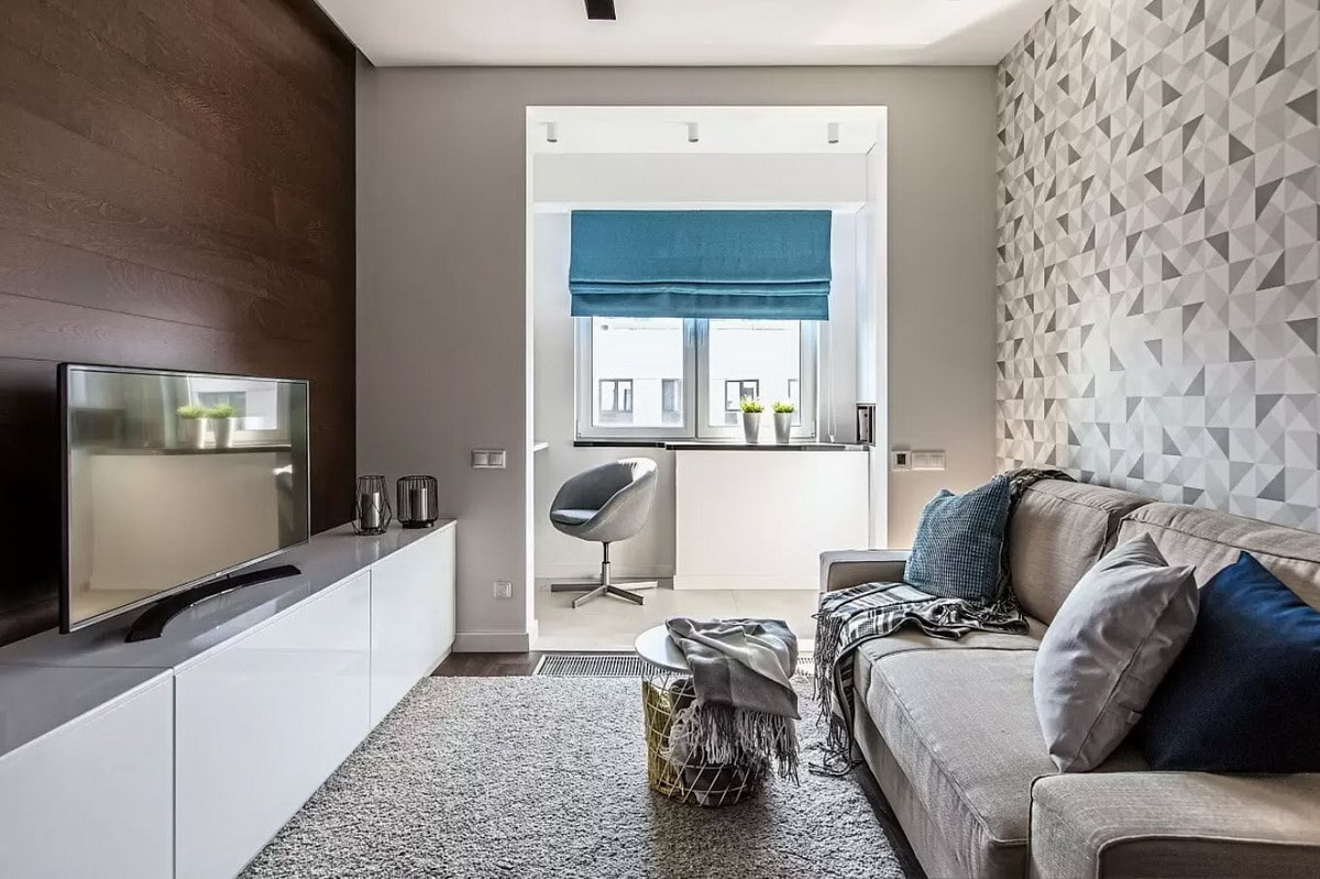 In the photo, the design of the living room in the Khrushchev in high-tech style.