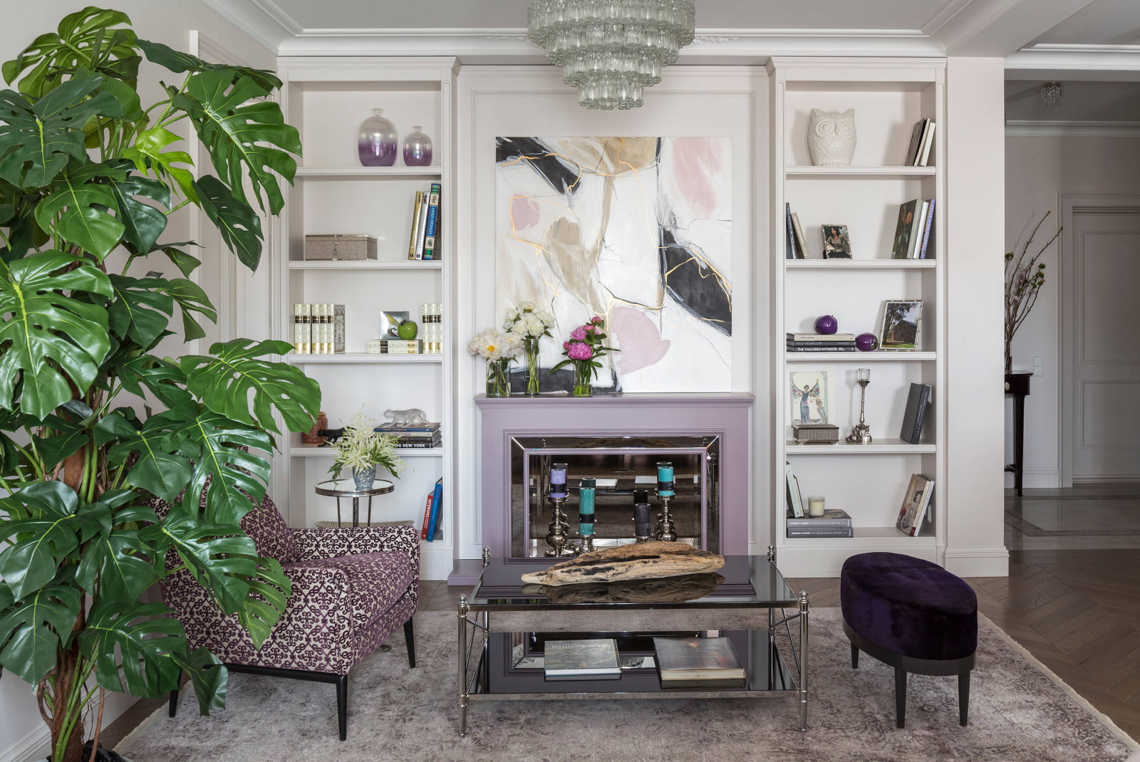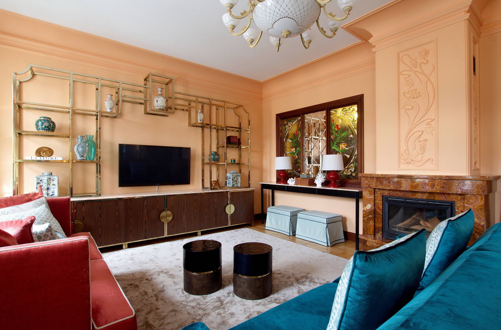 In the photo there is a living room in a neoclassical style. The walls on both sides of the fireplace are symmetrically painted dusty pink. The moldings on them are harmoniously combined with the stucco moldings on the ceiling.